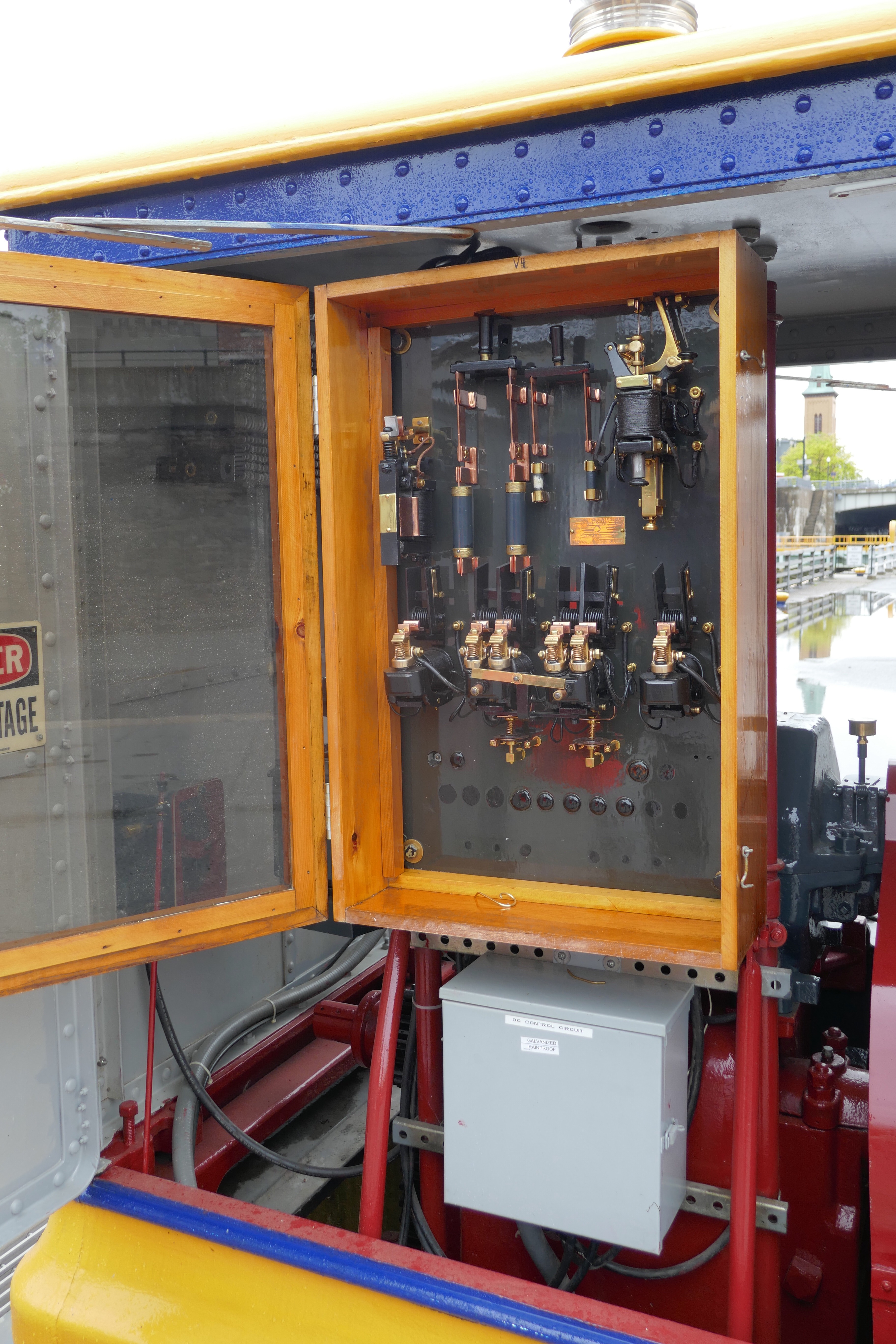 The gates and valves are operated on D.C. Power. The canal system used to have its own hydro plant using the water power from the Flight of Five, but they now use power off the grid. He showed me the electrical gear inside the cabinet: