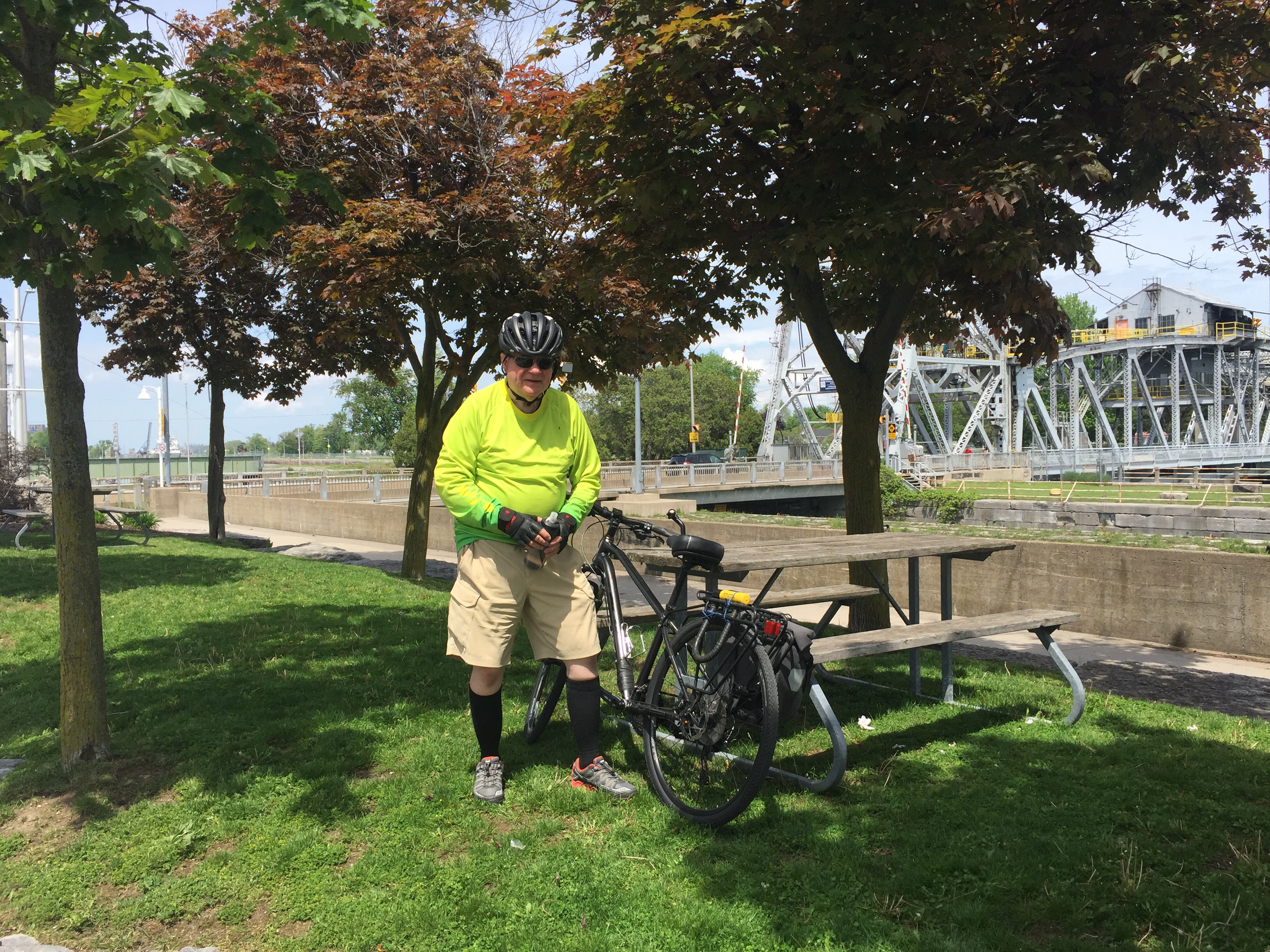 After riding about 3 miles on the trail, I came to a point of confusion, and stopped to look at the map, the Garmin GPS and GoogleMaps to figure out what to do. Just then, a man on a bicycle asked where I was headed, and when I said Ridgeway and then Port Colborne, he offered to ride with me, since that’s where he was headed too. It was wonderful to ride the next 12 miles on the paved bike trail with someone to talk to. We stopped in Ridgeway for lunch and then continued on to Port Colborne, which is where the Welland Canal provides ships access from Lake Erie to Lake Ontario.