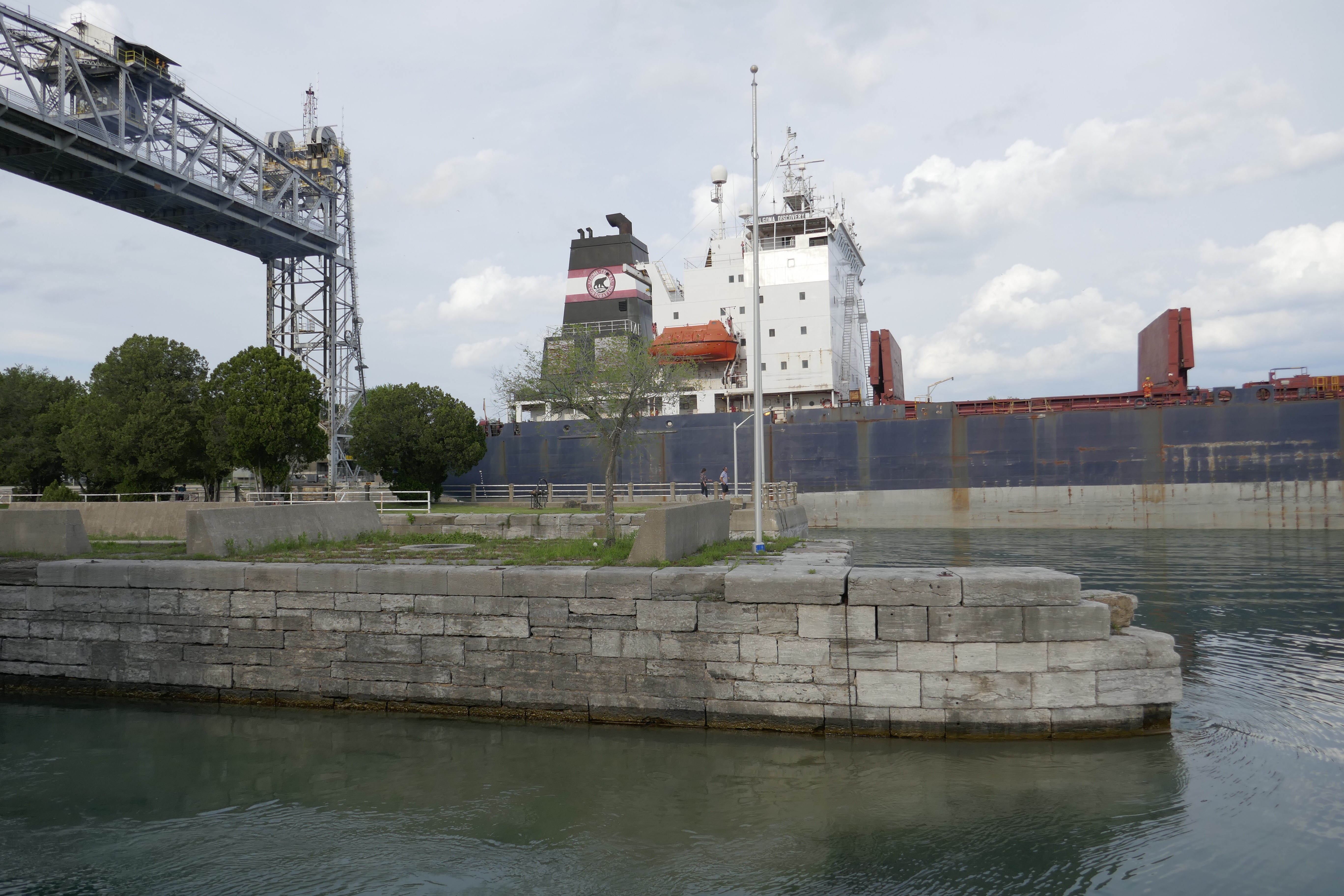 While we were sitting next to the canal, the lift bridge was raised for a ship headed to Lake Ontario. When I was in town for dinner, I say another ship, heading the opposite way: