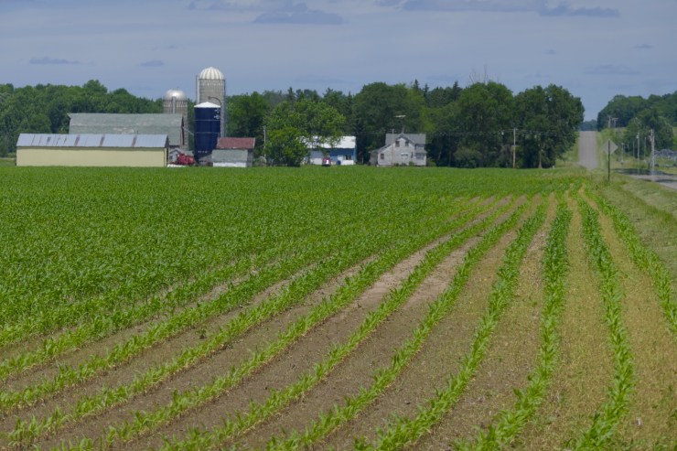 But in the meantime, I am riding on some quiet roads through forests, along lakes, crossing rivers, and later into some farmland – where there is actually a little bit of flat ground to grow corn (notice road on the right coming over a ridge – that’s where I was just riding to get to this spot):
