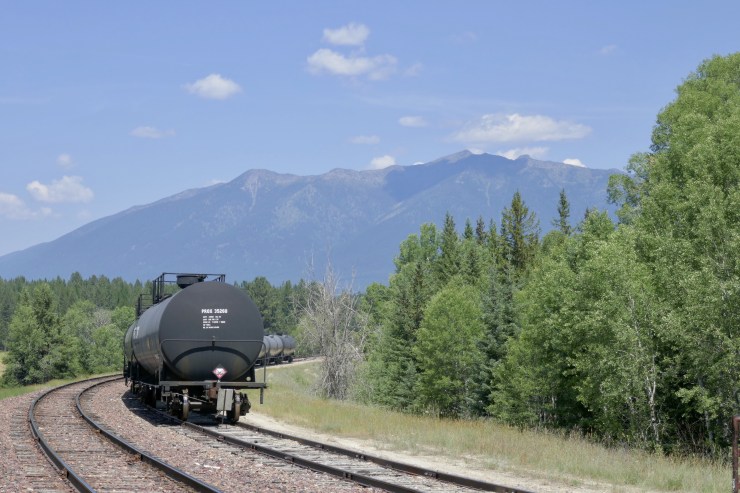 The last 14 miles to Eureka was also off of the highway, on back roads through ranches and forests. It was stunningly beautiful but difficult to capture in a photo – big scenery. I caught one photo of Montana elements: railroad, oil train, and mountains: