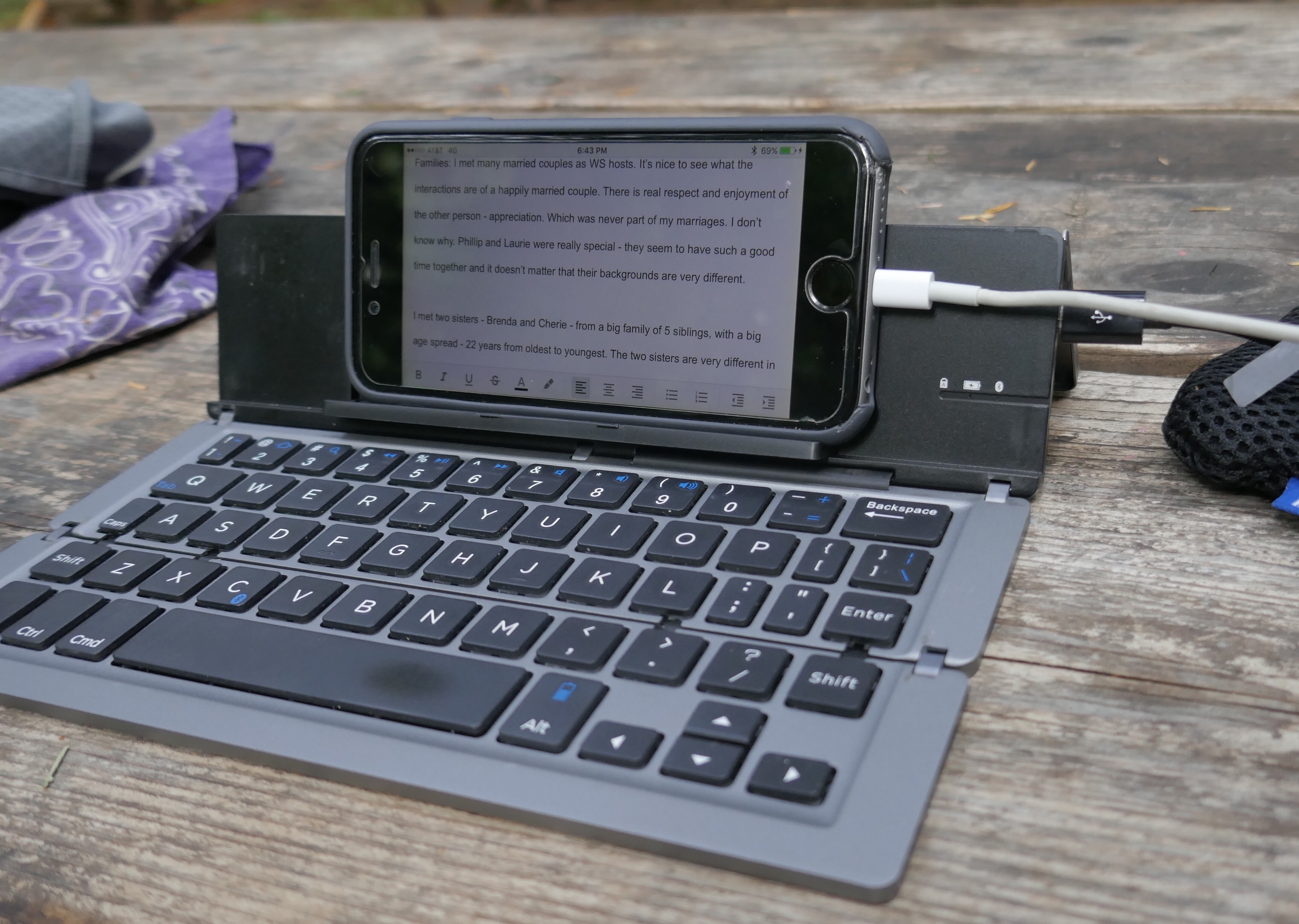 All together, this is a workable setup and adds minimal weight to the gear I am carrying. The keyboard is so cheap (made in China, purchased on Amazon) that I did not think it would last 2 + months, but it has (so far). Much easier than carrying a laptop or even an iPad. For me, it is worth it to be able to carry the camera (Panasonic ZS100) rather than a bigger tablet or laptop.